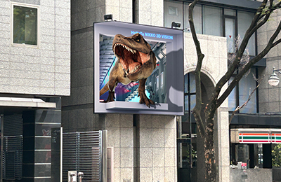 博多駅徒歩3分交差点角地に設置された大型3Dビジョン。博多駅徒歩圏内の一等地で高密度な交通・人流が期待できます。への字型2面LEDビジョンで、飛び出す3D動画広告の放映によりインパクトのある映像を流すことが可能です。