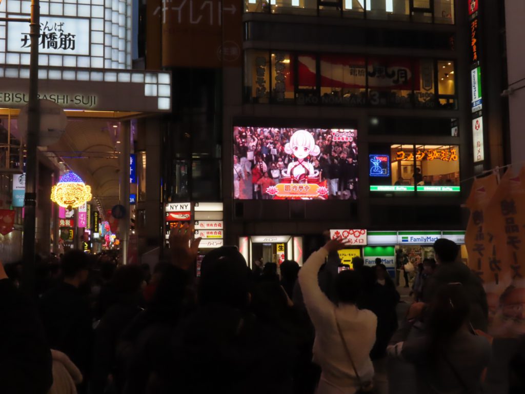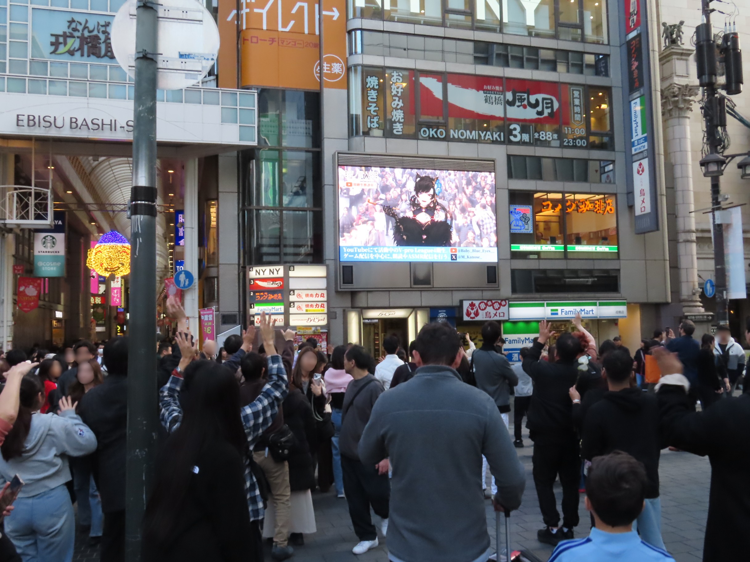 現地では足を止めてビジョンを見上げたりジェスチャーをとる通行人の姿も多く見られ、同時YouTube配信を通してコメントされていた方々とあわせて、生放送を楽しまれているご様子でした。