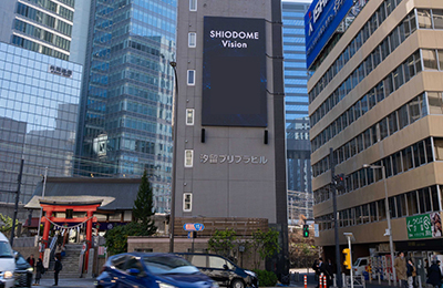 新虎通りと第一京浜の交差点に位置するSHIODOME Visionは新橋駅徒歩5分の好立地にあり、交通量も多く効果的な情報発信が可能です。付近には競合媒体が少なく、開けた空間の視認性もあいまって歩行者・車を問わず注目を集めます。