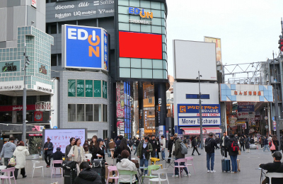 なんば広場は、大阪ミナミエリアの中心・海外旅行客にとっての西日本の玄関口です。目線の位置に設置してあるため強制視認性の高い媒体です。 なんば広場に面している面と双方の大阪・ミナミを代表する商店街に面している面があるため強いインパクトがあります。