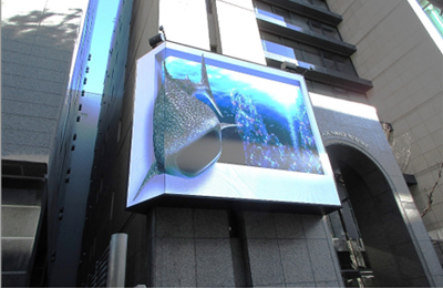 博多駅徒歩3分交差点角地に設置された大型3Dビジョン。博多駅徒歩圏内の一等地で高密度な交通・人流が期待できます。への字型2面LEDビジョンで、飛び出す3D動画広告の放映によりインパクトのある映像を流すことが可能です。